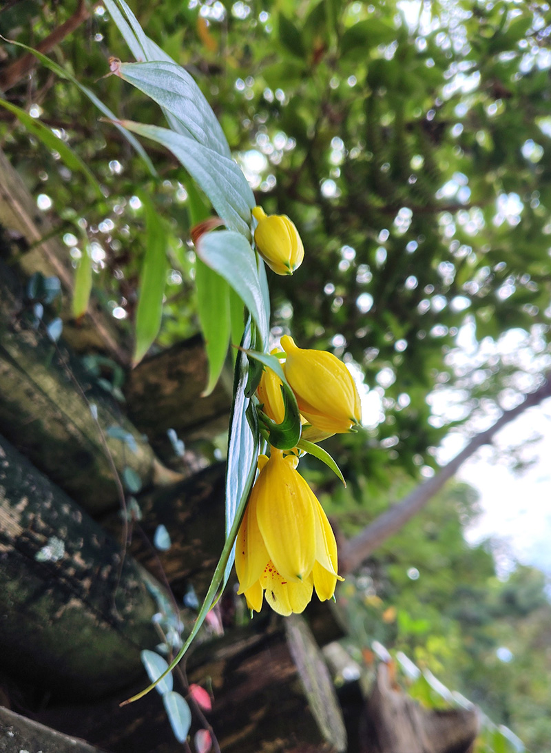 茎が立ち上がって咲くのが一般的なホトトギスの仲間ですが、この花はがけ地から茎が垂れ下がるように伸びて、そこに豪華な黄色の花を咲かせます。身分の高い女性の雰囲気を漂わせているということで上臈ホトトギスの名前が付けられました。キイは紀伊半島に自生するという意味です。