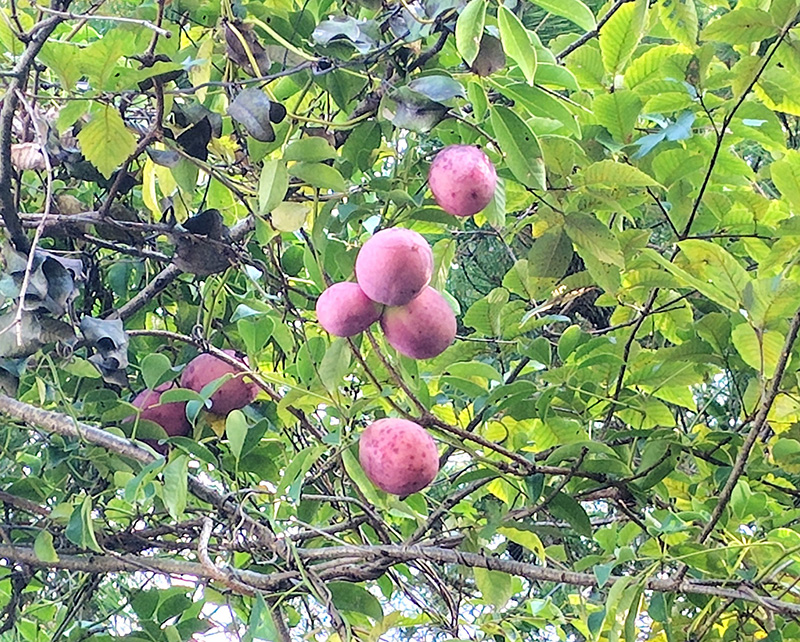 深い緑の葉の中に10㎝前後の大きさの丸い実がいくつもぶら下がっています。この実はアケビのように割れないので、メジロなどの野鳥は食べることができず、タヌキなどの哺乳類が食べることが多いようです。そのためか、皮にアケビのような苦みがなく皮まで甘いのです。