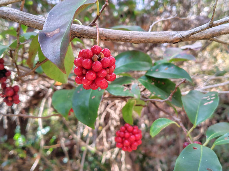 森においでよ サネカズラ 2025.12.22 サネカズラのツルに深い赤色の実がたくさんぶら下がっています。 今年はサネカズラも豊作のようです。 サネとは小実を意味するようですがそんなに小さな実とは思えません。 花托と呼ばれる部分が丸くなり、そこに直径5ミリほどの小さな実がたくさん集まってこんな形になっています。 深い緑の葉と真っ赤な実の対比が美しく、庭木や盆栽にもされますが、雌雄は別なので雌の株を植えないと実は楽しめません。 バリアフリートレイル入口付近で見られます。 Post Share ナナミノキ 関連記事 コンニャク ナツハゼ 塗魂ペインターズ カマツカ ヤブツバキ 雨