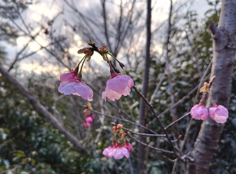 ヤマザクラの白い花がちらほら咲き始めたげんきの森に、早咲きの陽光桜が濃いピンクの花を咲かせ始めました。