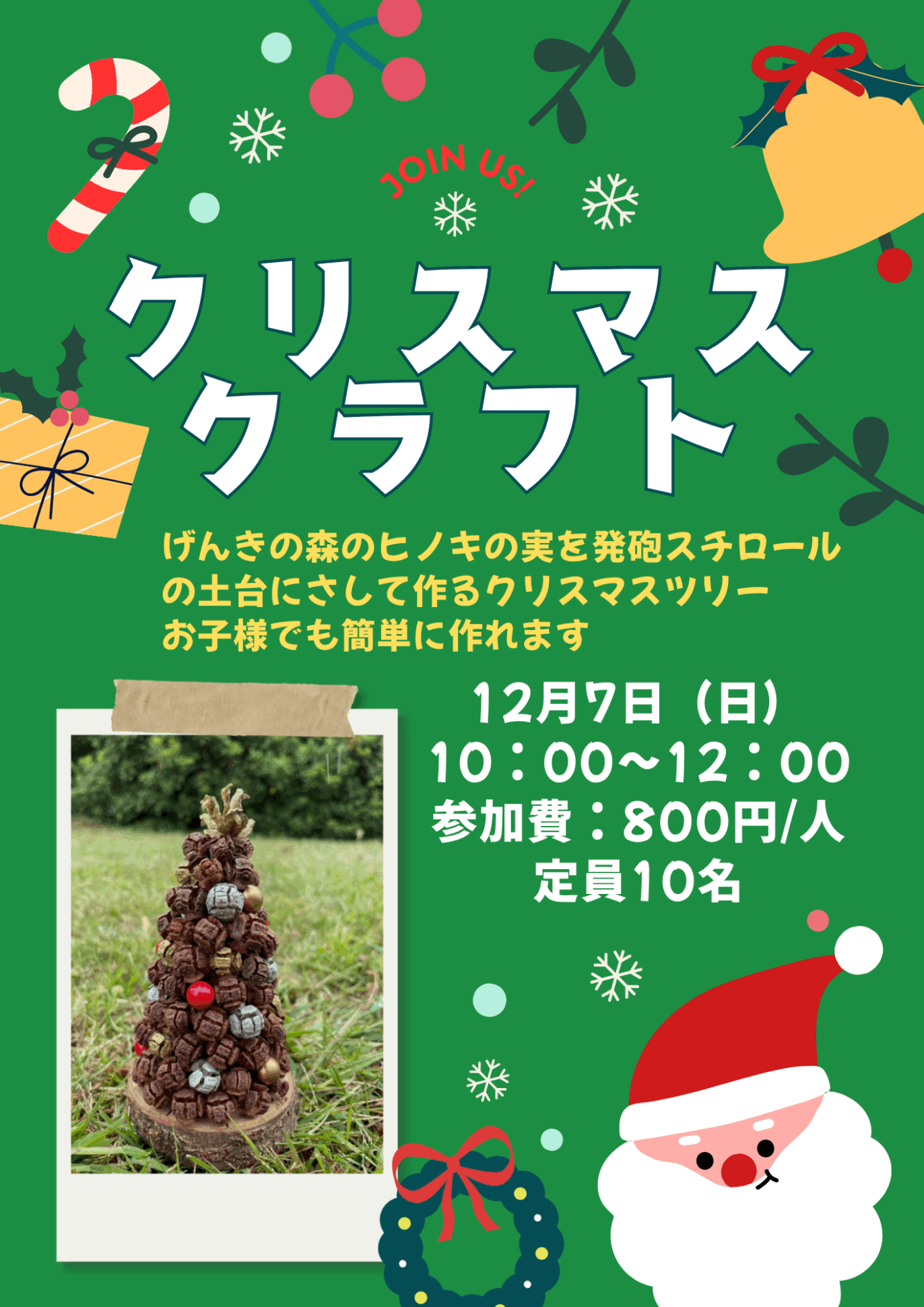 X’masクラフト 2025年12月7日 ミニクリスマスツリーづくり。小さなお子さんでも作ることができます。 【日時】2025年12月7日(日) 10:00~12:00 【内容】げんきの森のヒノキの実を発砲スチロールの土台に挿して作ります。小さなお子さんでも大丈夫ですよ。 【定員】10名 事前申込み必要 【参加費】一人 800円 お申込みはこちら