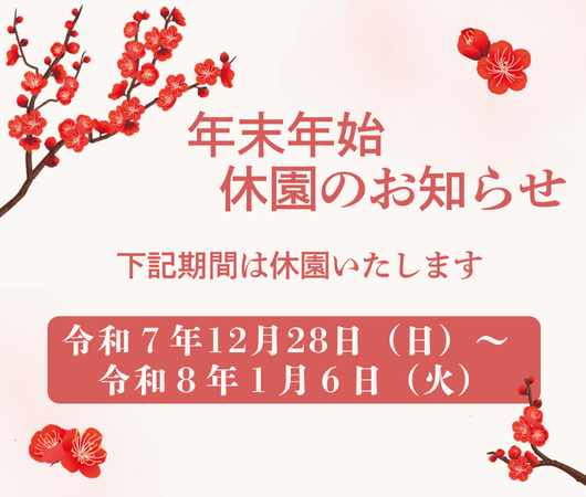 年末年始の休園日について 2025.12.16 令和7年12月28日(日)から令和8年1月6日(火)まで休園とさせていただきます。 新年は1月7日(水)から開園いたします。 よろしくお願い致します。 Post Share 塗魂ペインターズがやってきた! 1月のみ開園時間が変更となります 新着記事 お知らせ一覧 2025.12.21 ご理解ご協力お願いします(ペット禁止・エサやり禁止) 2025.12.21 1月のみ開園時間が変更となります 2025.11.23 塗魂ペインターズがやってきた! 2025.02.16 令和7年度イベント実施予定について 2023.03.10 根来山げんきの森倶楽部員新規募集